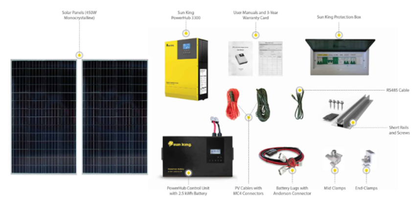 Powered by Sun king Dual PowerHub Ultra featuring 2*3.3KW Hybrid Inverter + 10KWh LiFePO4 Battery + 7.2KWp PV array. Connected loads include lighting + Borehole pump, etc.